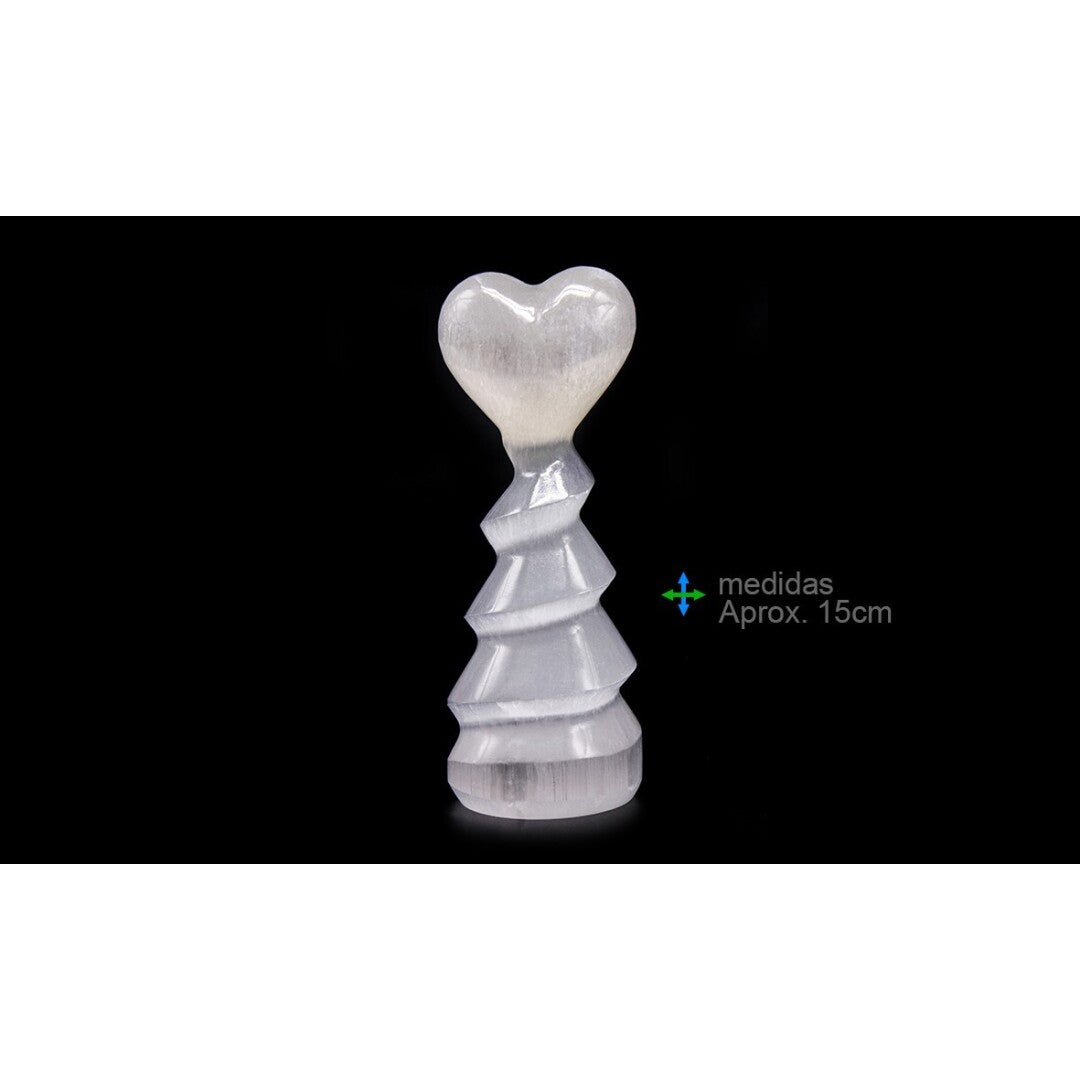 O Cristal Selenite, com 15 cm, é um mineral natural valorizado pelas suas poderosas propriedades curativas. Ele auxilia na saúde física, como problemas de coluna e digestão, e absorve radiações de aparelhos eletrónicos.